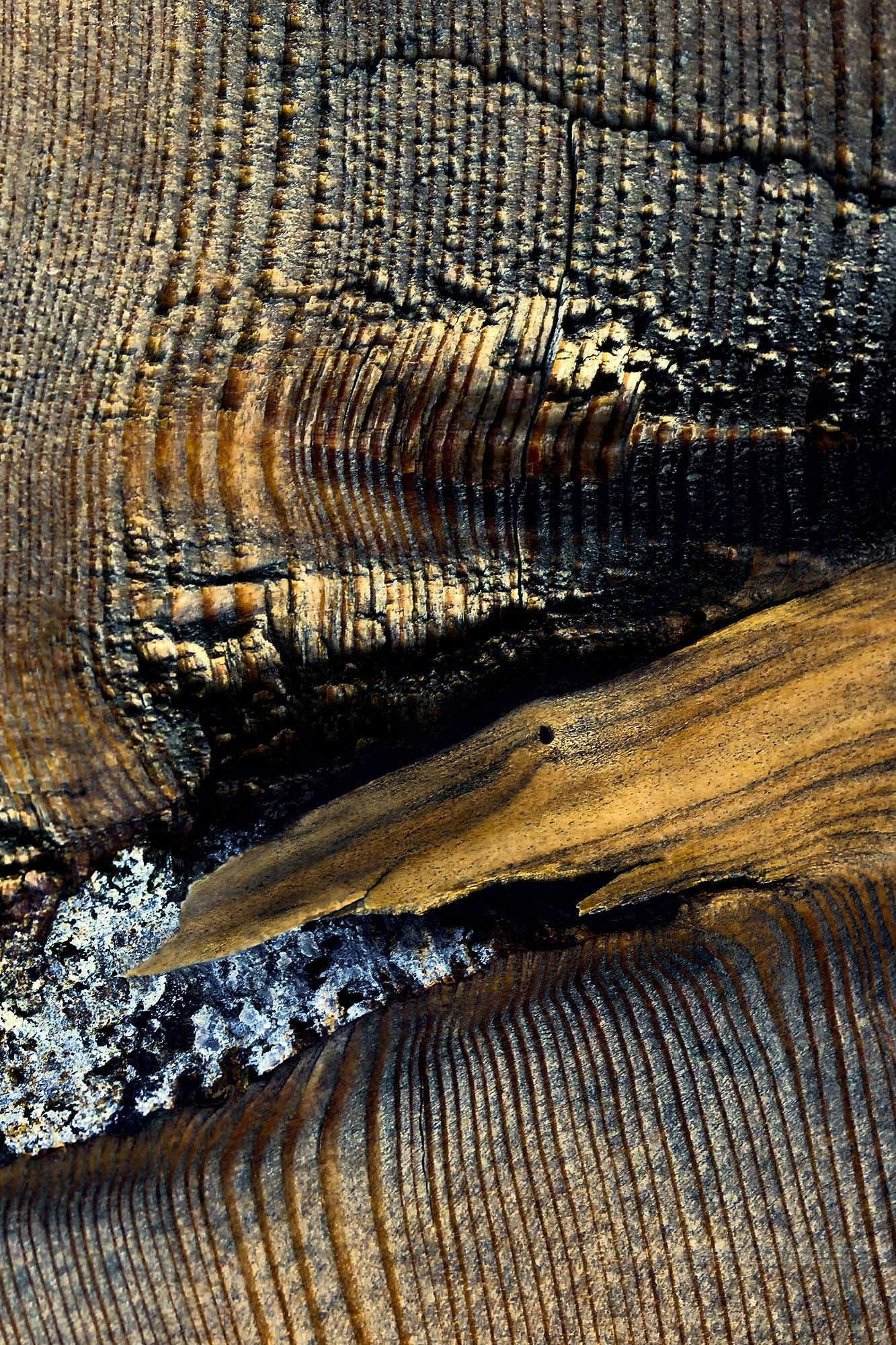 Langsam bildeten sich obsidianartige Seen, die silbern schimmerten und das genarbte Holz umschlossen.